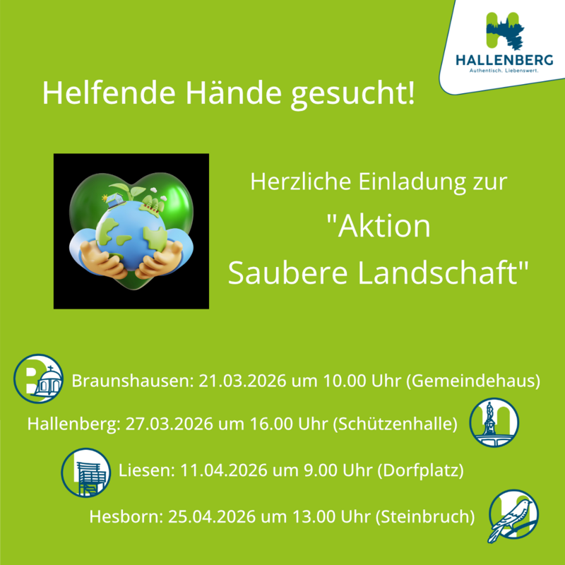 Hallenberg: Freitag, 27.03.2026 um 16.00 Uhr – Treffpunkt: Schützenhalle / Auch hier wird nach Abschluss der Aktion ein kleiner Imbiss für alle Helferinnen und Helfer angeboten.